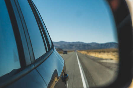 Looking into a rear view mirror of a car at a remote Nevada landscape, with a cow by the road side