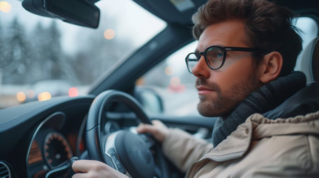 Driver navigates city streets during golden hour in a modern car capturing the essence of urban life and adventure on the road ahead