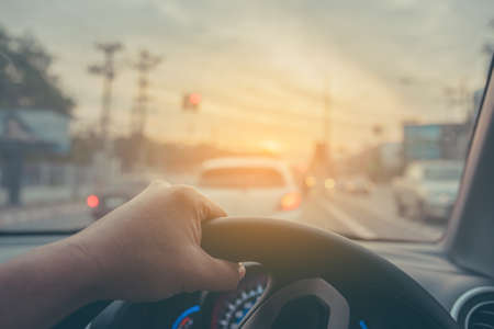Hands on wheel, Close up woman driving car on road with sunlight warm tone for come back to home.