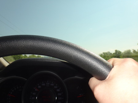 Hand of a man holding steering wheel. Close intrior of a automobile, particulary hand of a man on steering wheel.