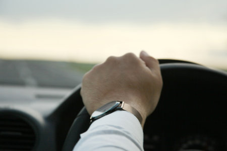 Close-up of hands steering a car, with a watch visible on the driver's wrist. Clear details and vibrant colors...