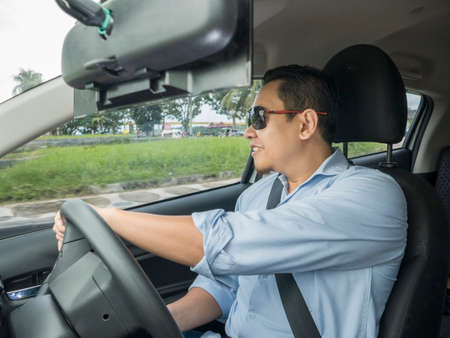 Portrait of young Asian man smiling and driving a car, good looking entrepreneur, car sharing concept