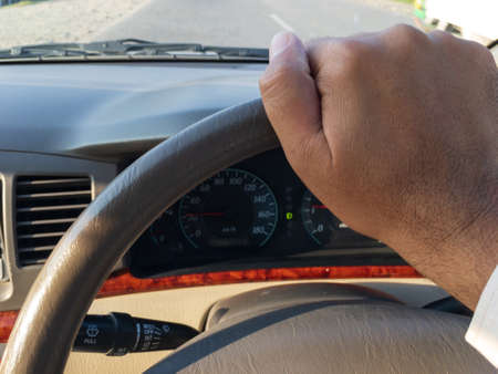 Photo of the hands of the driver on the steering wheel inside the car on the road