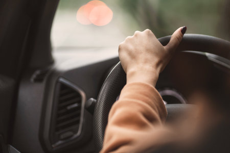 car steering wheel with driver hands on it, close-up of woman hands holding steering wheel
