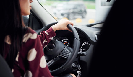 Close-up woman holding a car steering wheel, she is driving a car on a city street, car driving concept.