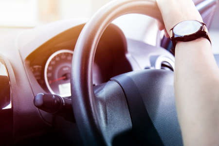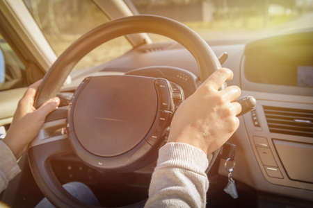Hands of the driver of the vehicle at the wheel of the car. Driving an auto car.