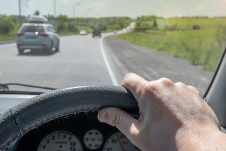 Driver hand gripping steering wheel with view of countryside road ahead through windshield. Man driving car in rainy day. Inside view of modern vehicle interior