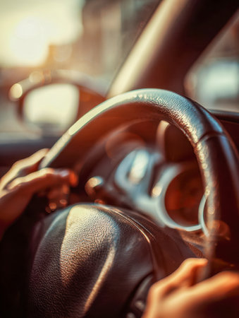 A hand firmly holds a textured leather wheel as golden sunlight filters through, casting a cozy glow on the sleek dashboard during a vibrant midday journey.