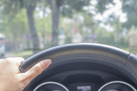 view of the hand of the people, the driver, holding the wheel of the car, closeup