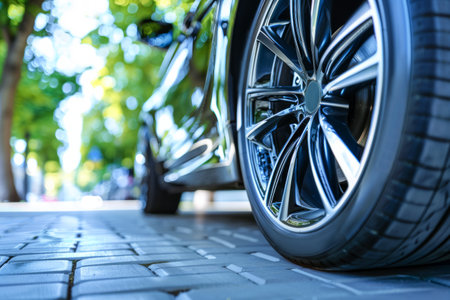 Urban car wheel close-up, rim details sharply defined against city pavement with faint reflections.
