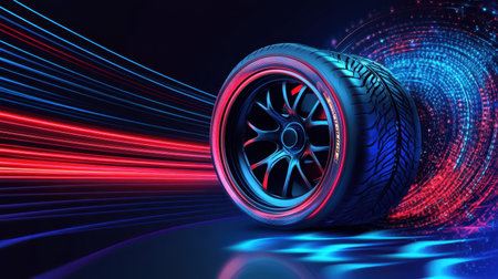 A striking image of a tire in motion, surrounded by colorful light trails. Ideal for topics on performance, technology, and automotive design elements.