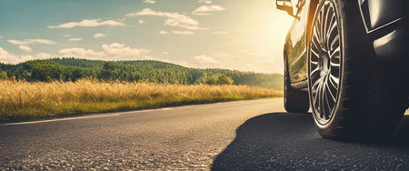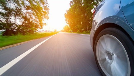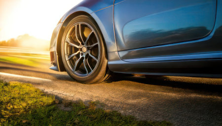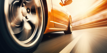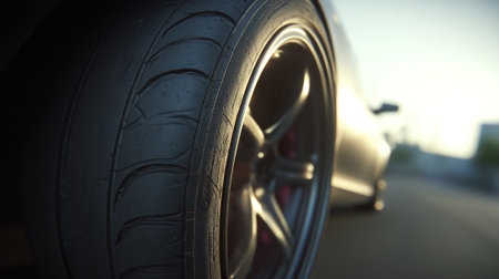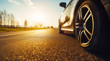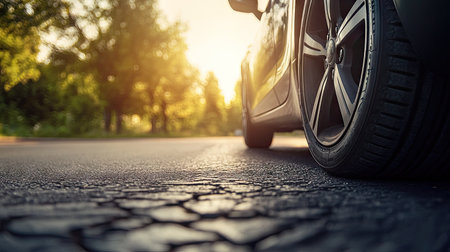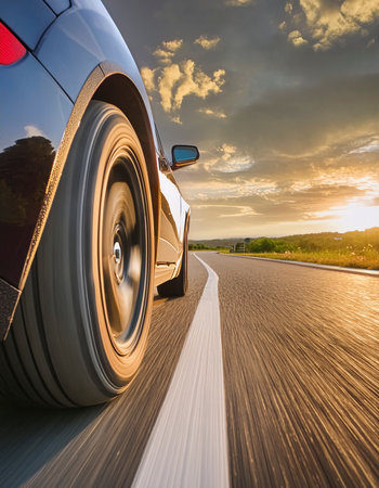 A captivating close-up shot of a car tire on an asphalt road, showcasing motion and speed during sunset. A blend of nature and vehicle dynamics.