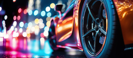 Close-Up of Rear Wheel of Sports Car on Wet City Street with Colorful Night Lights. High quality photo