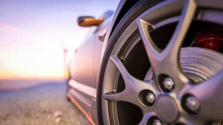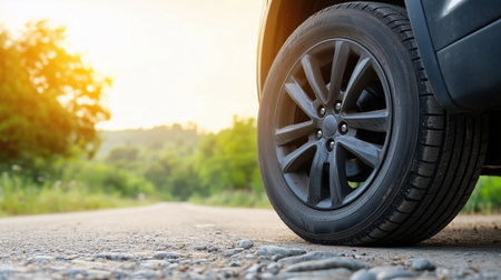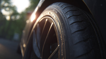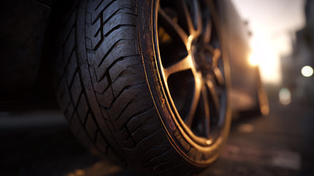 Close-up of a car tire on an asphalt road at sunrise with blurred background