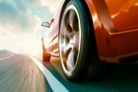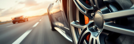 Dynamic close-up of a car wheel in motion highlighting speed and performance on a winding road at sunset