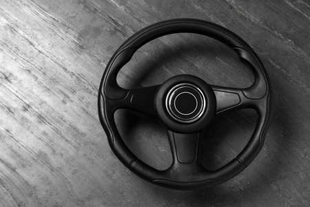 Black steering wheel on yellow background, top view with space for text. Banner design
