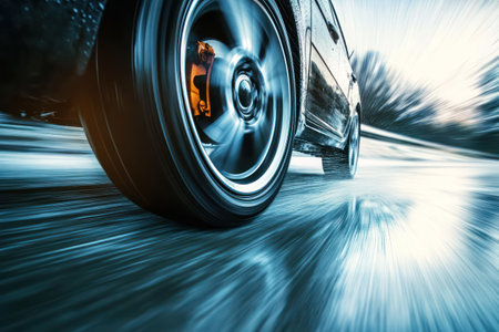 Dynamic close-up of a car wheel in motion on the road, emphasizing speed, travel, and automotive performance.