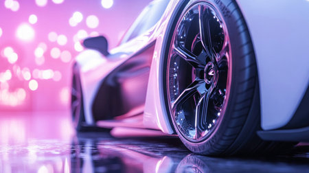 A striking low-angle photograph captures a car tire's mesmerizing reflection on wet pavement, illuminated by vibrant neon purple and blue lights. The close-up detail reveals the tire's rim and textured surface, juxtaposed with the water droplets and abstract patterns. This urban, modern image is perfect for automotive design, luxury branding, or contemporary art, adding a dynamic touch to projects related to night, city life, and automotive transportation. The play of light and reflection creates a compelling visual narrative.