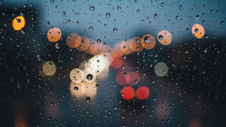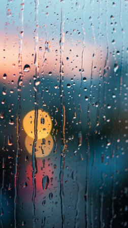 Close-up capture of rain drops on a glass window, showcasing a colorful background with a soft bokeh effect, enhancing the mood of tranquility and beauty.