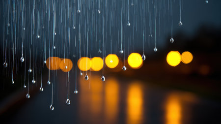 An enchanting scene featuring rain drops cascading against a backdrop of softly glowing city lights. The reflections create a serene nighttime ambiance.