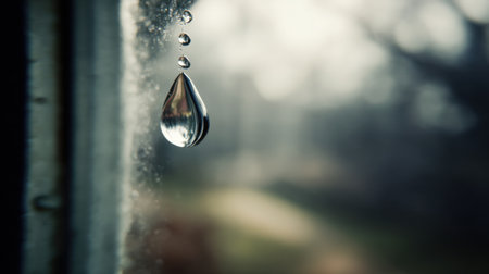 A solitary raindrop hangs from the edge of a window, reflecting light and the softly blurred scenery outside, creating a peaceful atmosphere during rainfall.