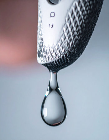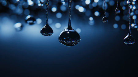 In a stunning macro view, perfectly formed water droplets hang suspended from a futuristic blue apparatus before falling. This image captures a moment of purity and technological precision, ideal for concepts related to innovation, science, hygiene, and environmental conservation.