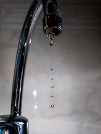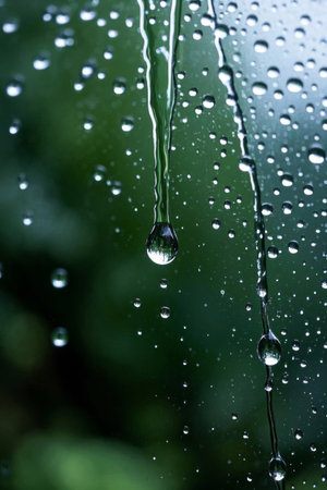 This image presents a close-up of water drops cascading downwards. The droplets are clear, reflecting the environment. A blurred background with soft bokeh effects adds depth. It suggests potential use for themes related to nature, hydration, or scientific illustrations, suitable for various commercial or editorial applications.