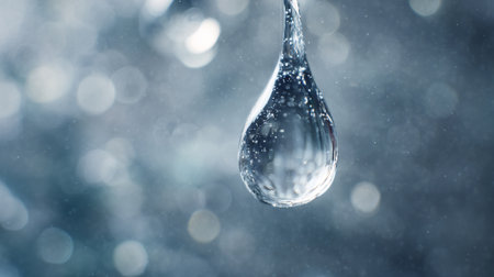 A close-up captures a water drop suspended against a blurred backdrop. The image displays a smooth texture, with cool tones dominating the scene. The composition evokes a sense of freshness and purity, suitable for various editorial and commercial applications. The background includes bright lights.