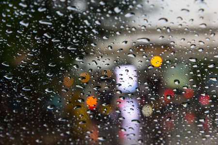 Drops of rain on the window. Rainy days in the city landscape. Defocused