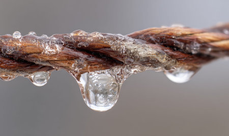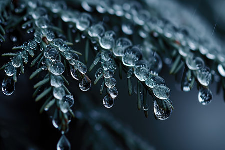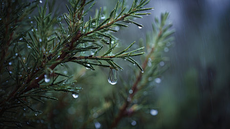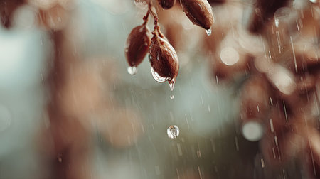 Soft rain falling gently, with water droplets forming and slowly dripping. The background is softly blurred with natural, moody atmosphere.