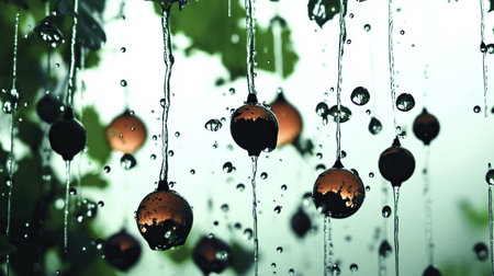 Macro photography of fresh raindrops dripping from a leaf after a downpour. The image evokes a sense of calm, freshness, and the tranquility of nature.
