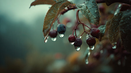 Soft rain falling gently on Chokeberry, with water droplets forming and slowly dripping. The background is softly blurred with a natural, moody atmosphere.