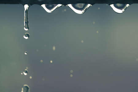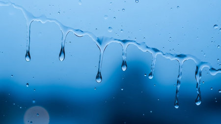Close-up view of clear water droplets in various sizes slowly dripping down a smooth blue surface. The background is softly blurred with bokeh lights, creating a serene and refreshing atmosphere. The captures the delicate movement of liquid and the purity of water.