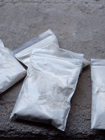 Cocaine in plastic packet isolated on white background. illustration of illegal drug substances, white powder, narcotics