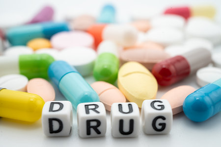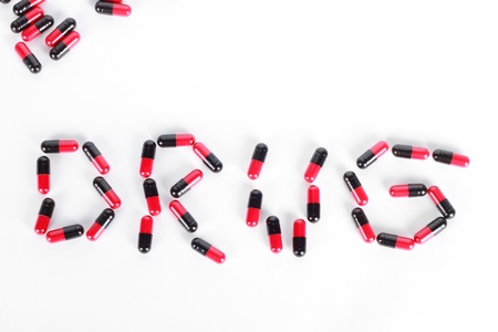 Drug word with pills and capsules medical drug.