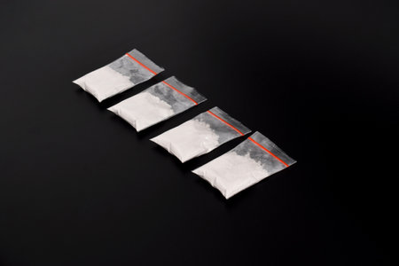 Cocaine in plastic packet isolated on black background. illustration of illegal drug substances, narcotics