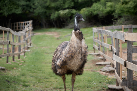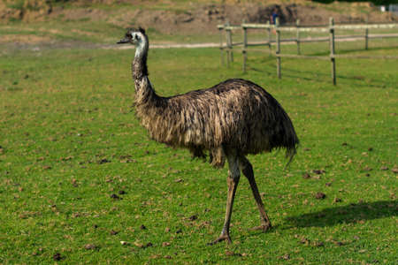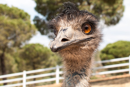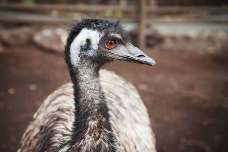 Close up view of Australian ostrich emu known as Dromaius novaehollandiae is the second largest living bird on the planet. Farmer breeding of ostriches, organic farming concept.