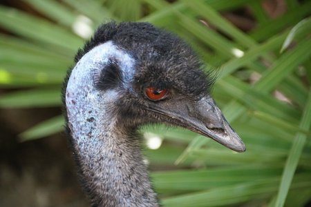 The unusual face of a blue emu with a black beak.