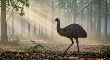 Emu walking in a misty forest in the morning light.