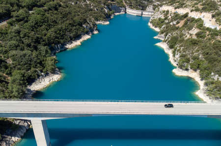 Aerial view on blue lake Sainte-Croix-du-Verdon, bridge, forest, cliffs, tourists destination in France