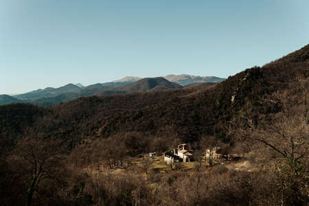 landscape of catalan Garrotxa countryside in the countryside of catalonia region during winter with mountains and old house