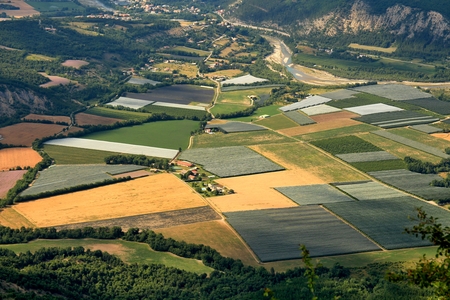 Aerial view of agricultural landscape. Fields in France.