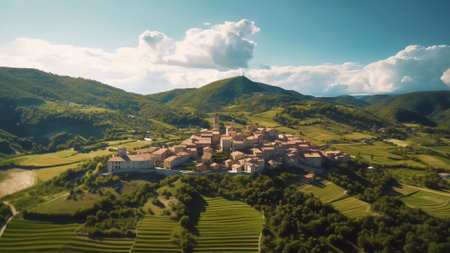 Aerial view of Tuscany landscape with fields and village in Italy