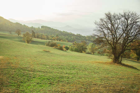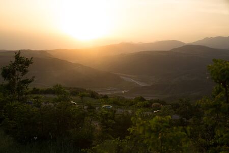 Beautiful landscape in the mountains with the sun at dawn. Mountains at the sunset time. Azerbaijan Caucasus Mountains.