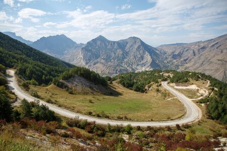 Image of picturesque mountain area, road, blue sky with clouds