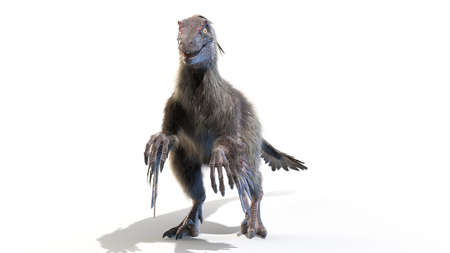 Deinonychus raptor dinosaur feeding. 3D illustration isolated on white background.