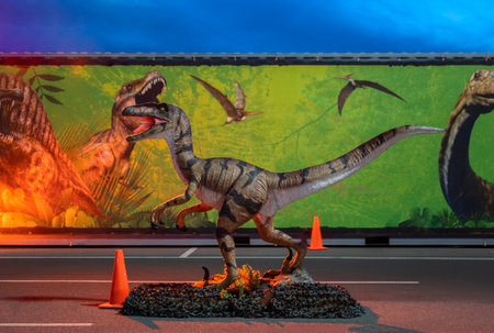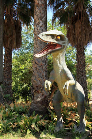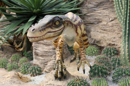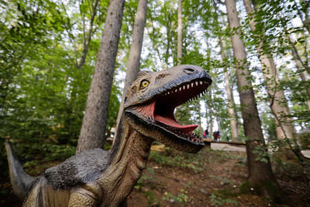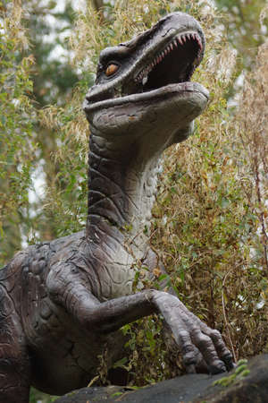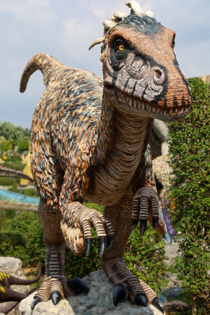 Rasnov, Romania - October 3, 2020: Details with a Deinonychus dinosaur model at an outdoors dino park in Romania.