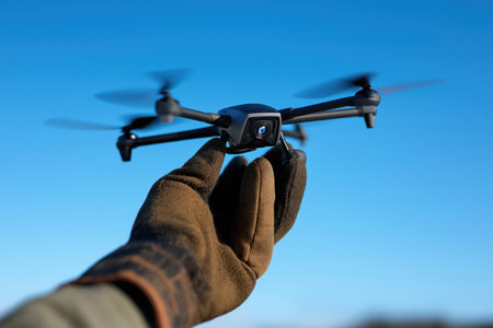 High-quality close-up of a drone held in a gloved hand. Perfect for technology, innovation, and aerial photography concepts. Clean background.