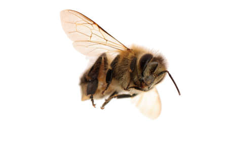 Photography of bees isolated on white background for image cropping and manipulation in image editing program. Flying insects carrying pollen.