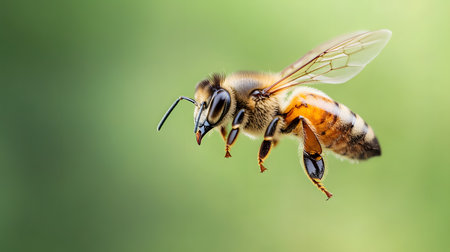 A striking close-up of a flying honey bee showcasing its intricate details and vibrant colors against a soft green background in nature's beauty.